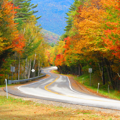 ニューハンプ州ホワイトマウンテンズ国立公園のある町、リンカーンから西のコンウェイまでの全長約55kmのカンカマガス・シニック・ハイウェイはアメリカでも有数の紅葉景勝道路。ドライブ中、谷間を見渡す絶景が眺められる展望台に立ち寄りながら、紅葉をお楽しみください。